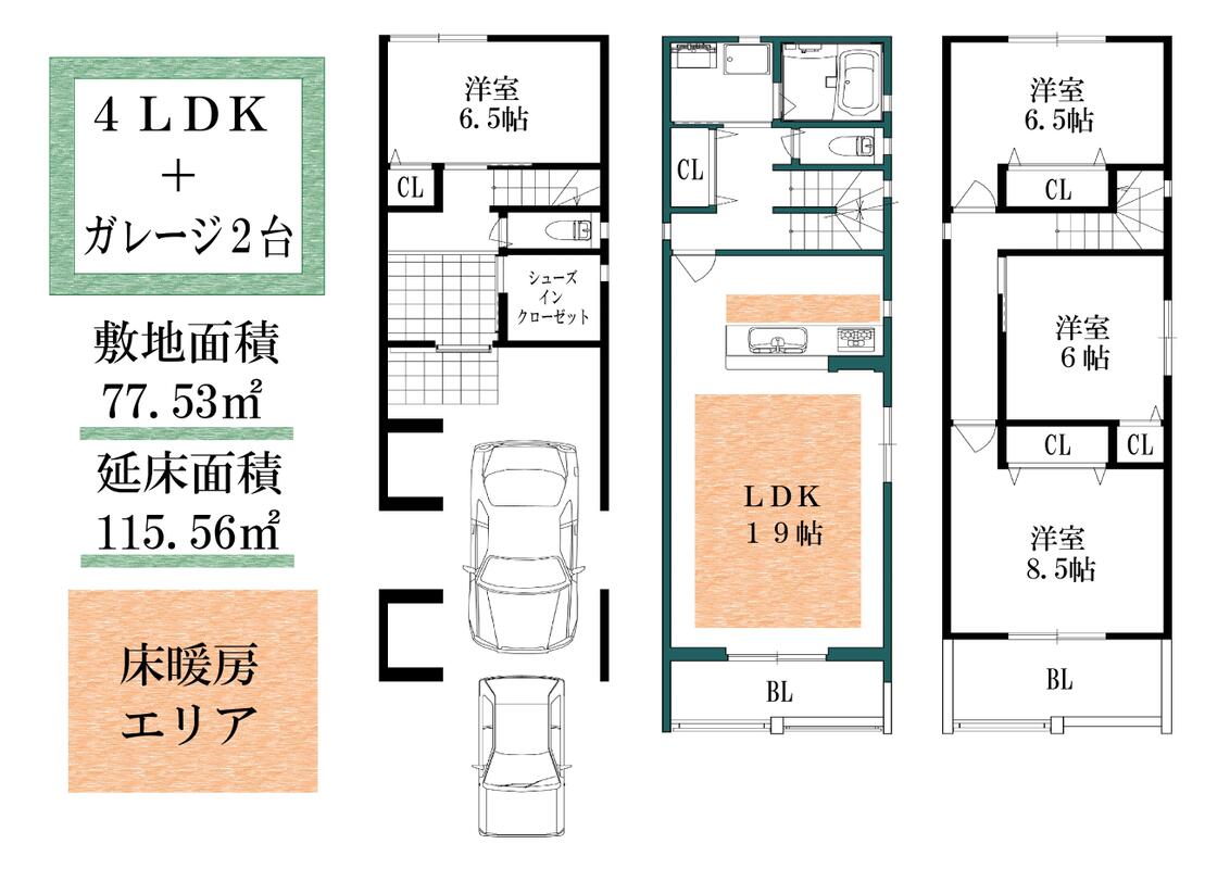 | 建物面積 | 106.54m2~115.56m2 | 土地面積 | 63.61m2~76.13m2 |