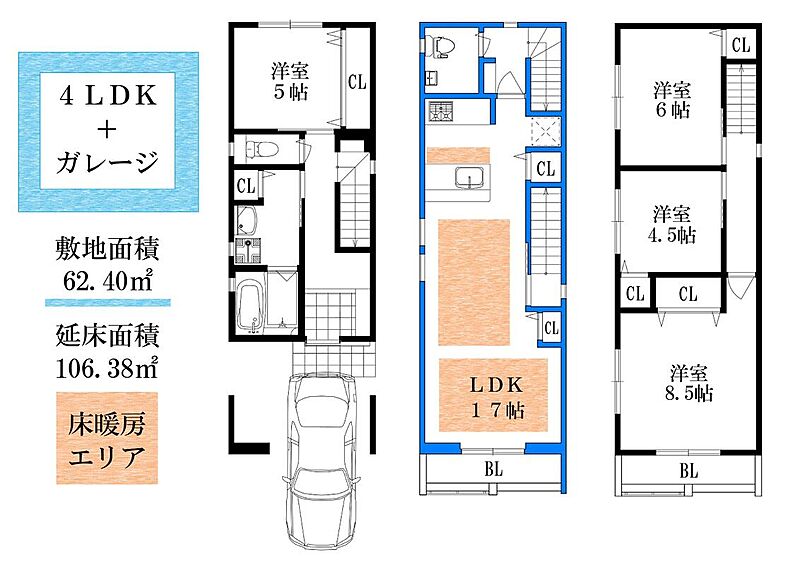 | 建物面積 | 105.17m2~106.38m2 | 土地面積 | 62.40m2~62.59m2 |