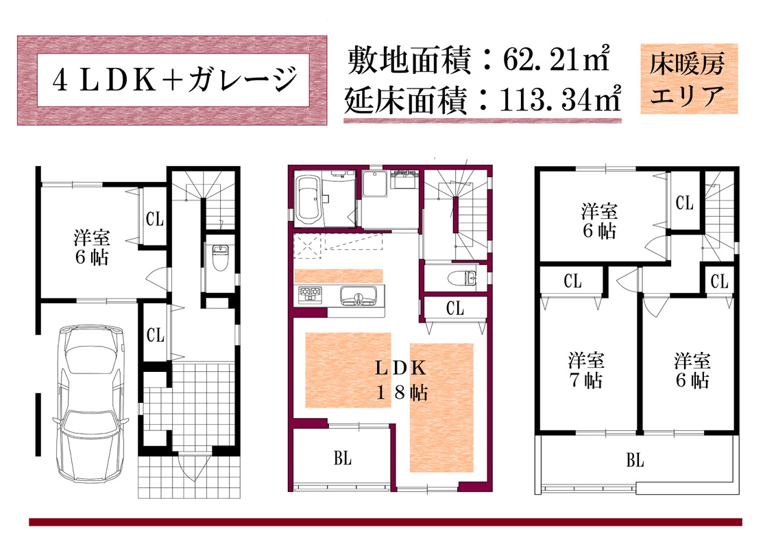 | 間取り | 3LDK+ガレージ2台。4LDK+ガレージ1台 | 建物構造 | 木造3階建 |