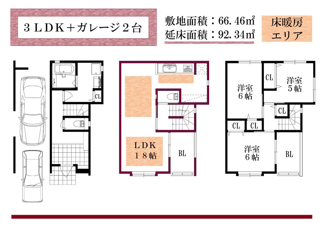 - 3LDK+ガレージ2台。4LDK+ガレージ1台