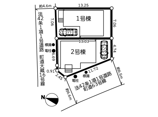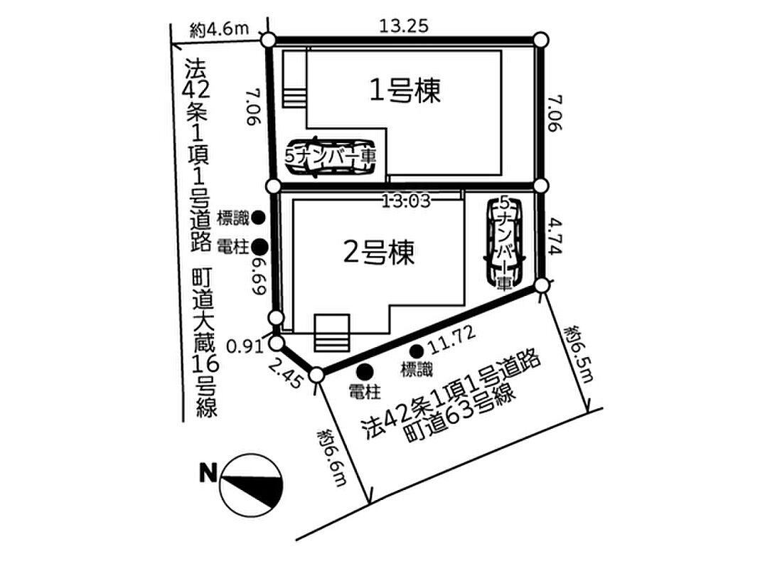 | 駐車場 | 1台 | 道路の幅員 | 2号棟:北4.6m 南西6.5m |
