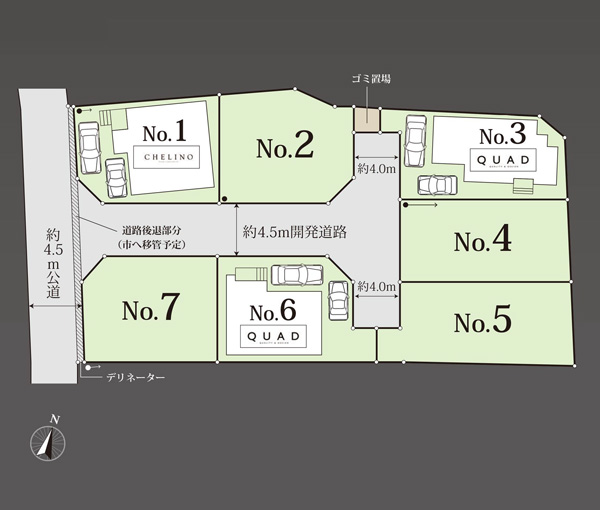 | 駐車場 | 2台 | 道路の幅員 | 6号棟:北西4.5m /1号棟:西4.5m 南東4.5m /3号棟:南西4.5m |