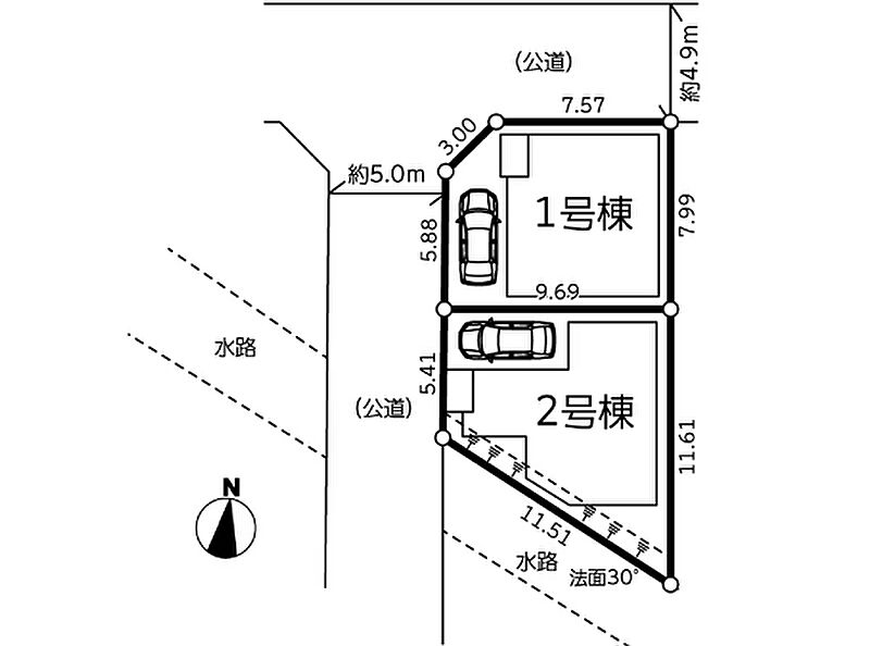 | 駐車場 | 1台 | 道路の幅員 | 2号棟:西5m /1号棟:北4.9m 西5m |