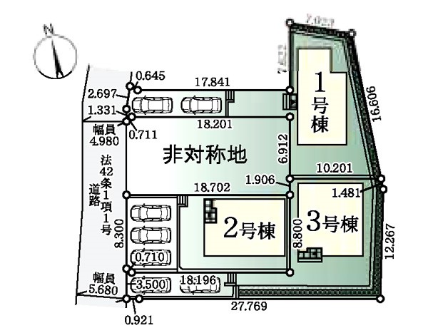 | 駐車場 | 3台 | 道路の幅員 | 1号棟:西4.9m /2号棟:西5.6m |