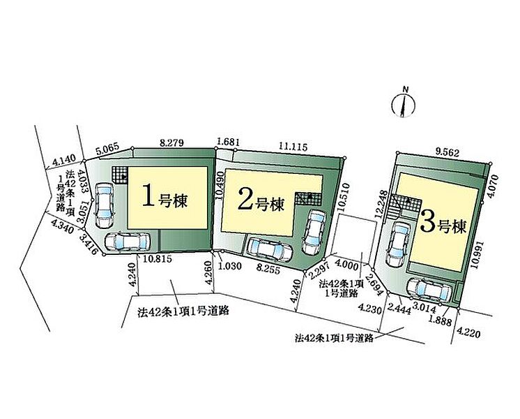 | 駐車場 | 2台 | 道路の幅員 | 2号棟:南4.2m /3号棟:南4.2m /1号棟:西4.3m 南4.2m |