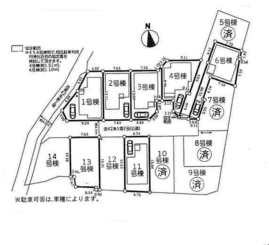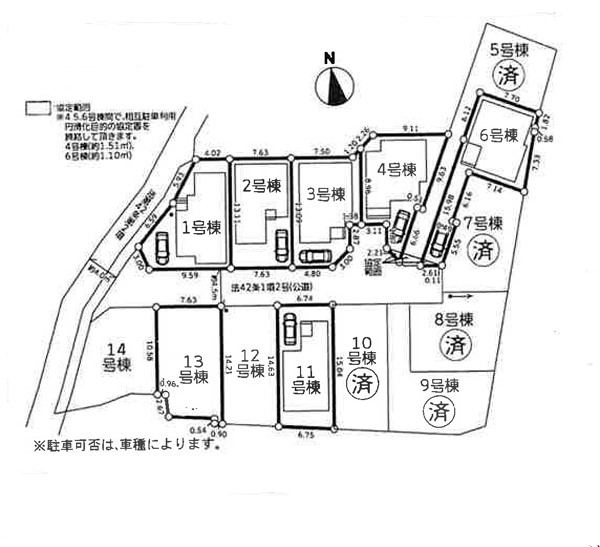 | 駐車場 | 1台 | 道路の幅員 | 13号棟:北4.5m /1号棟:南4.5m 北西4m |