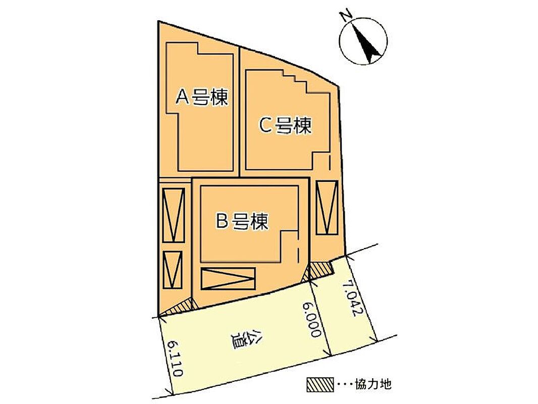 | 駐車場 | 2台 | 道路の幅員 | A号棟:南6.1m /B号棟:南6m /C号棟:南6m |