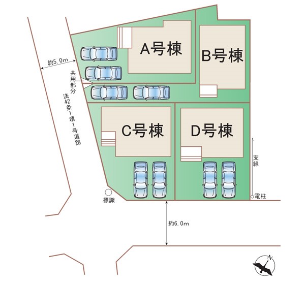 | 駐車場 | 2台 | 道路の幅員 | C号棟:南西5m 南東6m /B号棟:南西5m |
