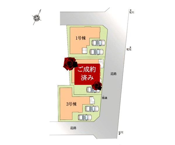 | 駐車場 | 2台 | 道路の幅員 | 1号棟:北東5.9m 北西4m /3号棟:北東5.9m 南東4m |