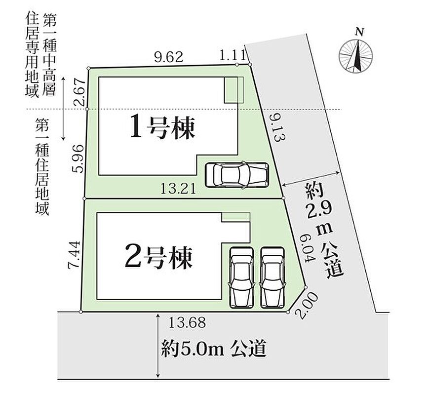 | 駐車場 | 1台 ~ 2台 | 道路の幅員 | 1号棟:東2.9m /2号棟:東2.9m 南5m |