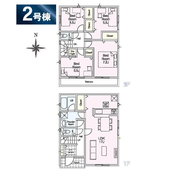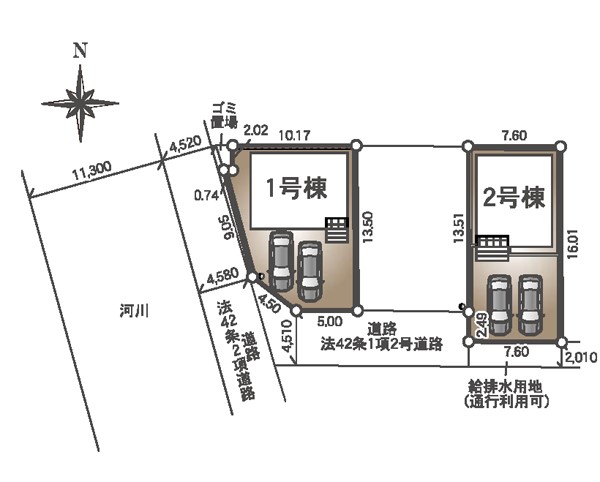 | 駐車場 | 2台 | 道路の幅員 | 1号棟:南4.5m 西4.5m /2号棟:南4.5m |
