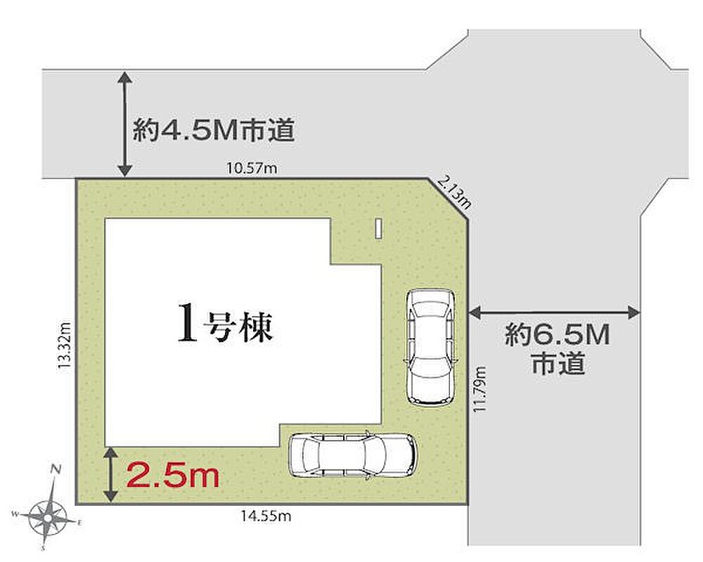 | 駐車場 | 2台 | 道路の幅員 | 1号棟:東6.5m 北4.5m |