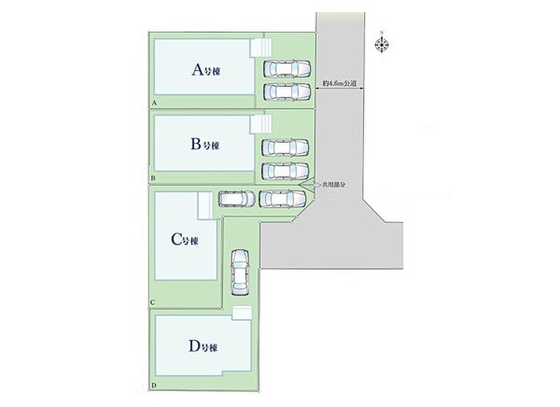 | 駐車場 | 2台 | 道路の幅員 | B号棟:東4.6m /A号棟:東4.6m |
