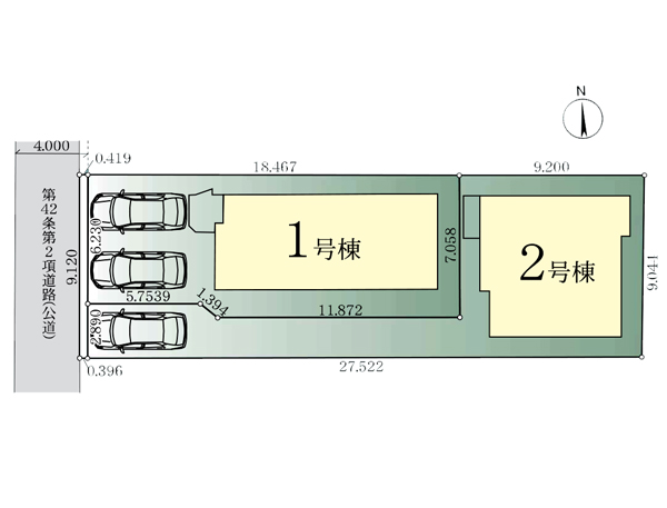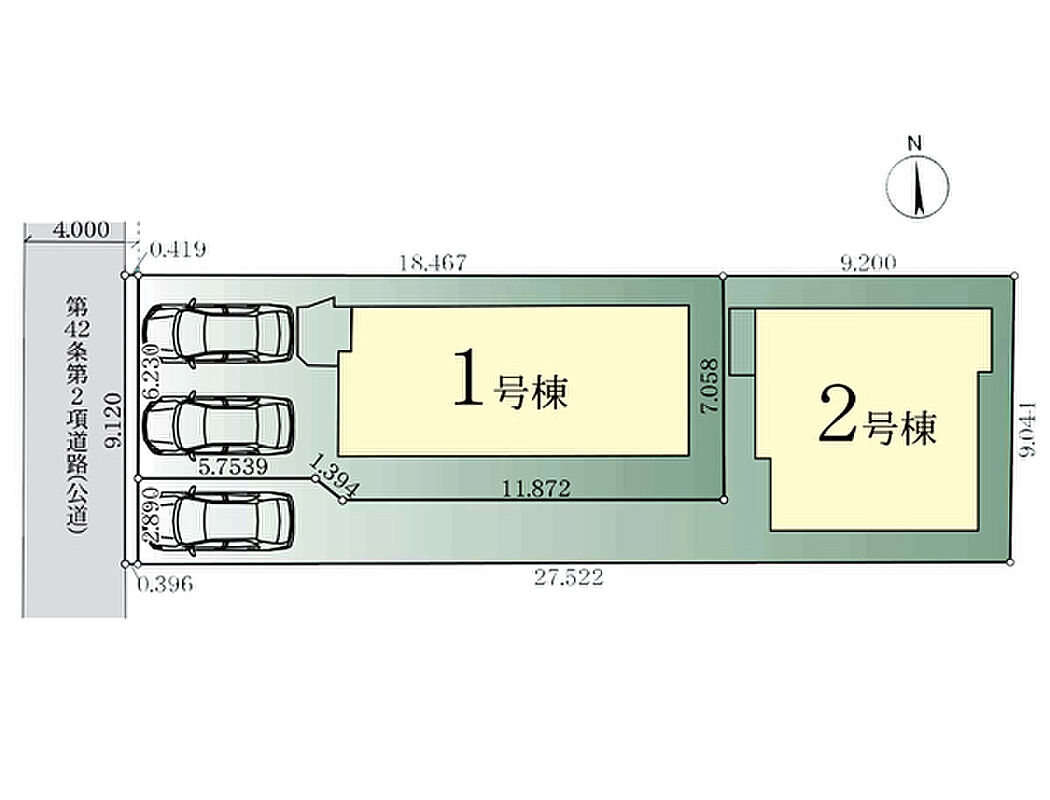 | 駐車場 | 1台 ~ 2台 | 道路の幅員 | 2号棟:西4m /1号棟:西4m |