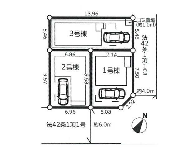 | 駐車場 | 1台 | 道路の幅員 | 2号棟:南東6m /1号棟:北東4m 南東6m /3号棟:北東4m |