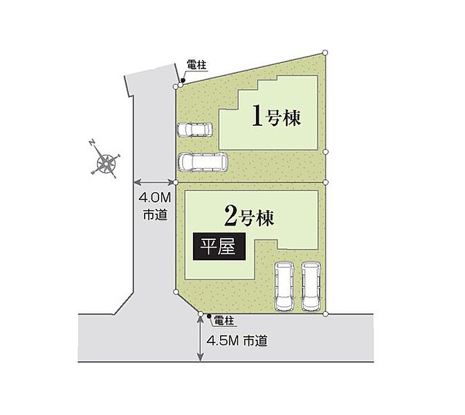 | 駐車場 | 2台 | 道路の幅員 | 2号棟:北西4m 南西4.5m |