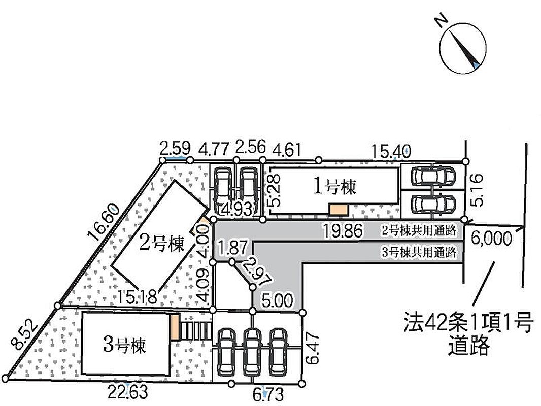 | 駐車場 | 2台 ~ 3台 | 道路の幅員 | 1号棟:南東6m /3号棟:南東6m /2号棟:南東6m |