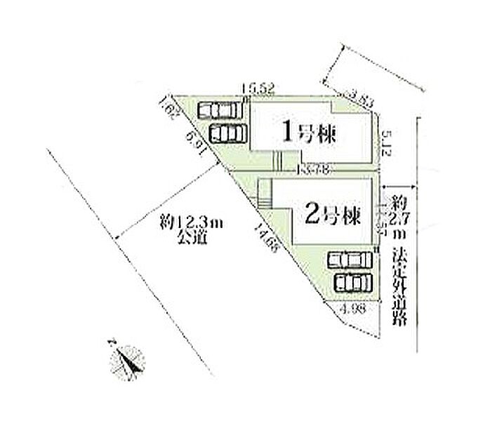 | 駐車場 | 2台 | 道路の幅員 | 2号棟:西12.3m /1号棟:西12.3m |