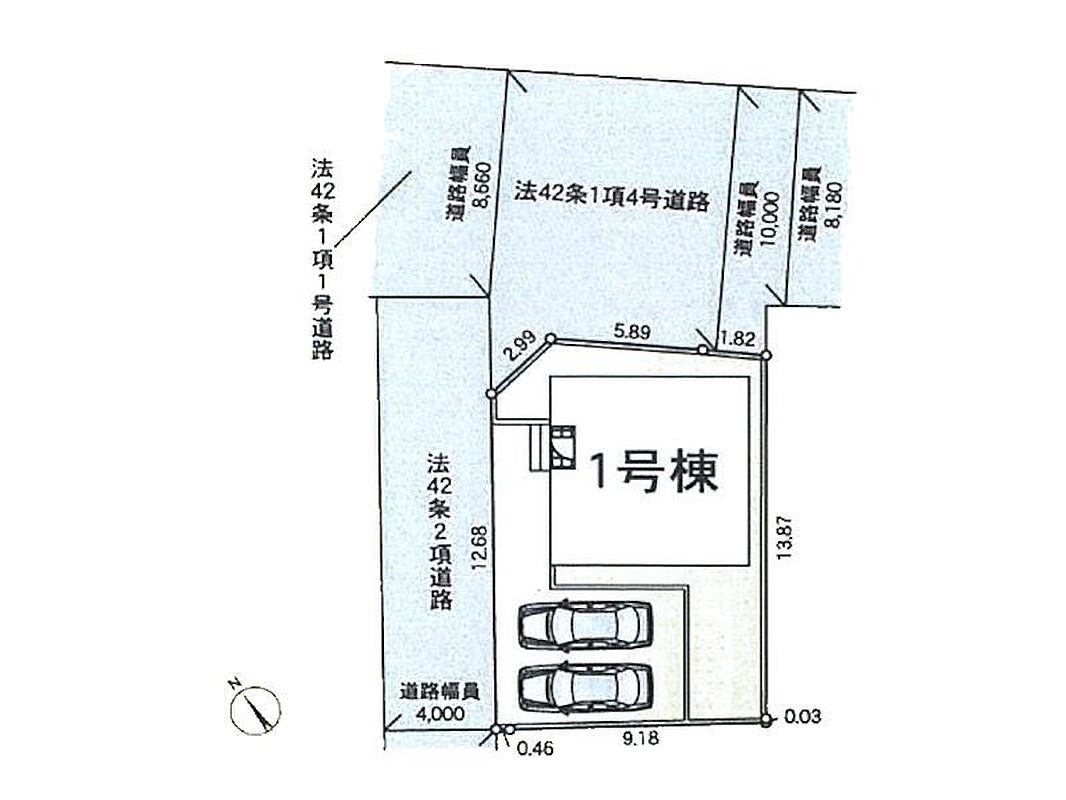 | 駐車場 | 2台 | 道路の幅員 | :北東10m 北西4m |
