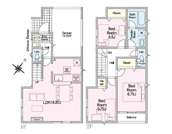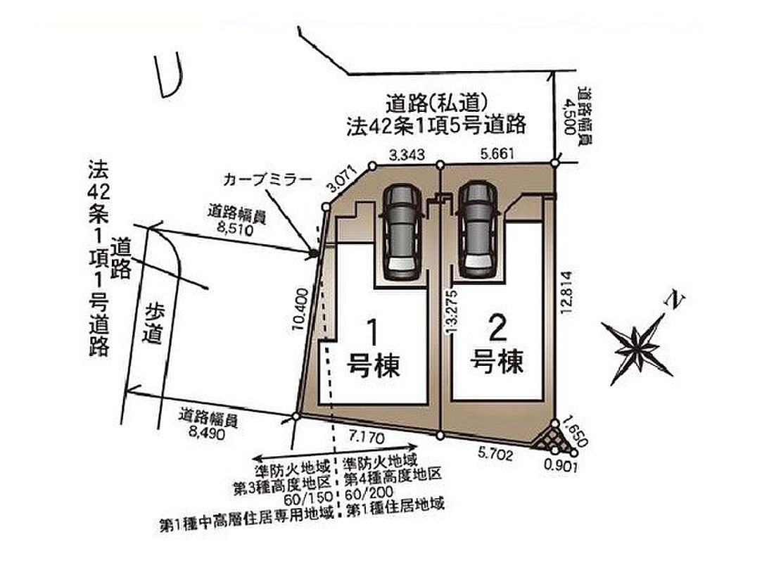 | 建物面積 | 92.33m2~92.94m2 | 土地面積 | 78.01m2~78.09m2<私道負担面積123m2 私道負担割合1/16> |