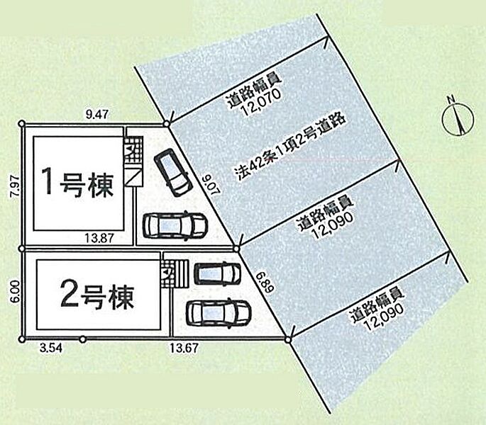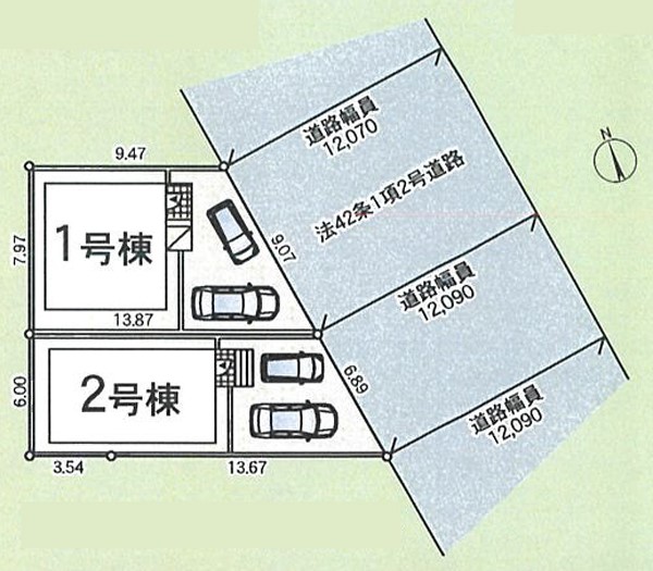 | 駐車場 | 2台 | 道路の幅員 | 1号棟:東12m /2号棟:東12m |