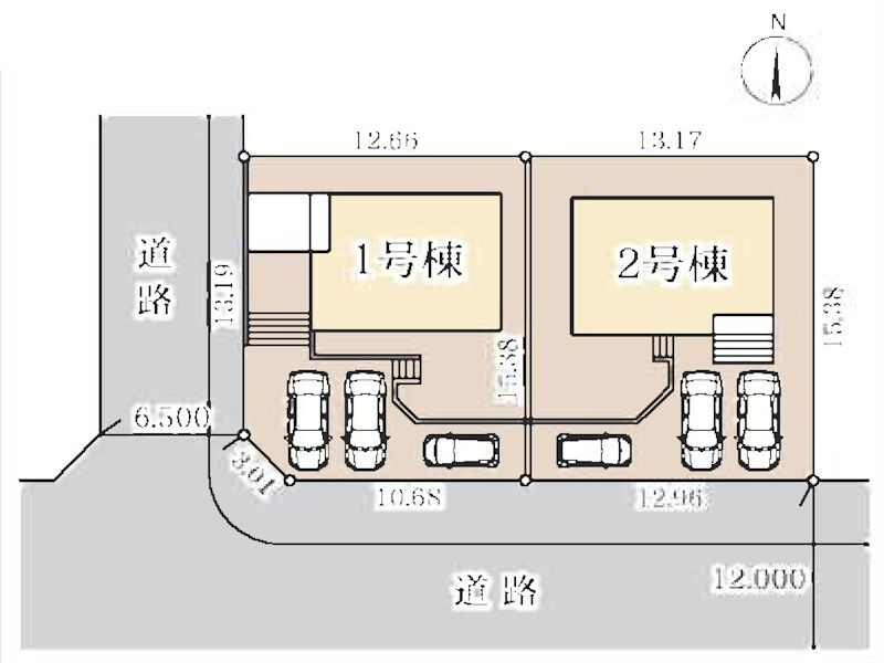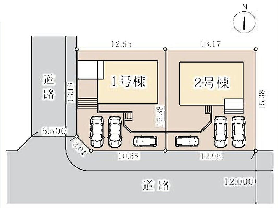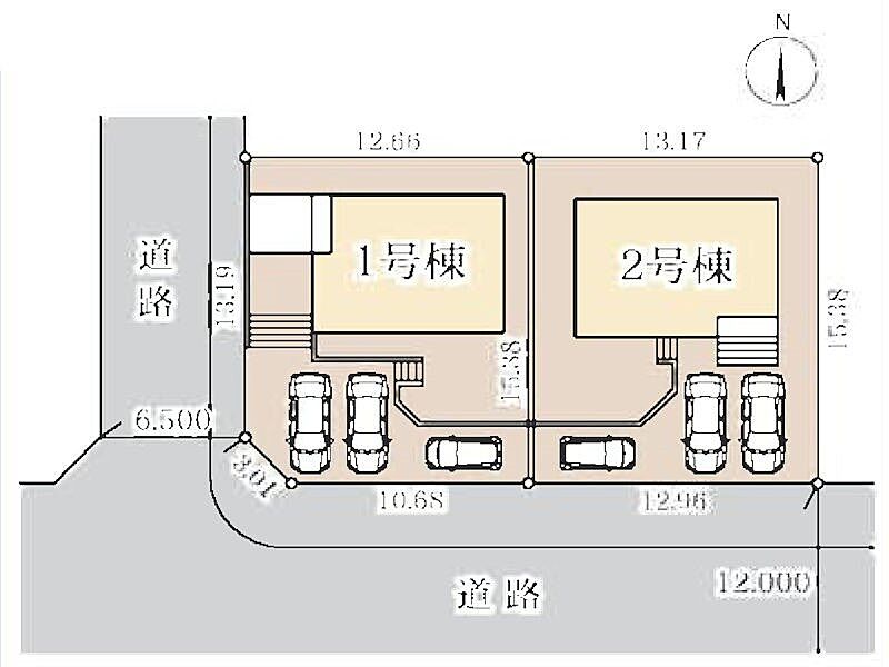 | 駐車場 | 2台 | 道路の幅員 | 1号棟:南12m 東6.5m /2号棟:南12m |