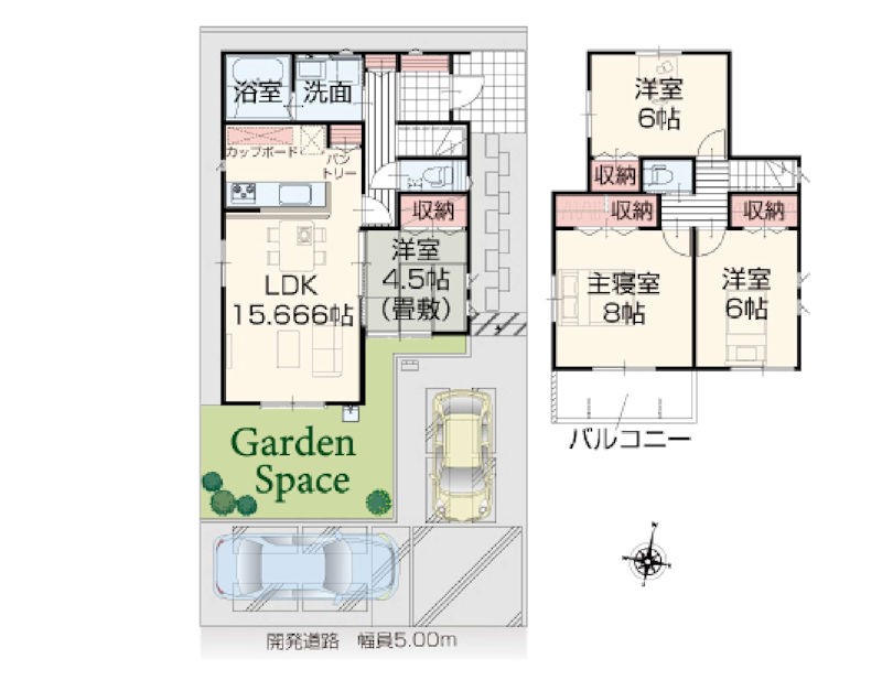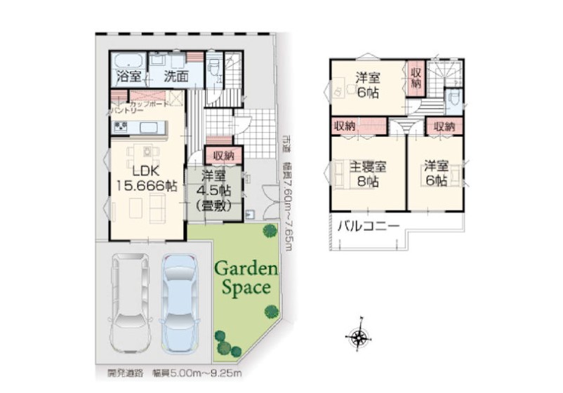 | 駐車場 | 2台 | 道路の幅員 | 1号棟:南5m 東7.6m /7号棟:南5m /6号棟:南5m /11号棟:北5m |