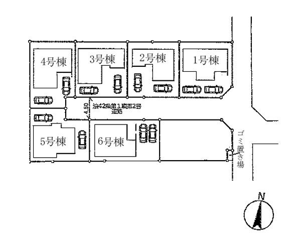 | 駐車場 | 2台 | 道路の幅員 | 6号棟:北4.5m /2号棟:南4.5m /5号棟:東4.5m /3号棟:南4.5m /1号棟:東4.5m 南4.5m |