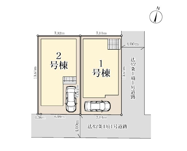 | 駐車場 | 1台 | 道路の幅員 | 1号棟:南4m 東4m /2号棟:南4m |