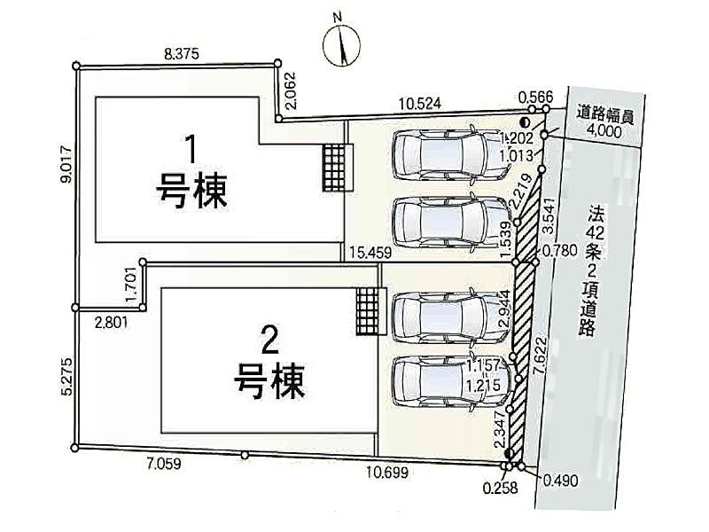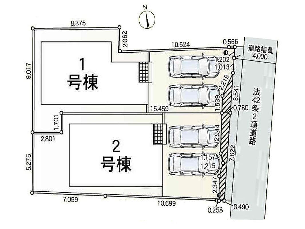 | 駐車場 | 2台 | 道路の幅員 | 1号棟:東4m /2号棟:東4m |