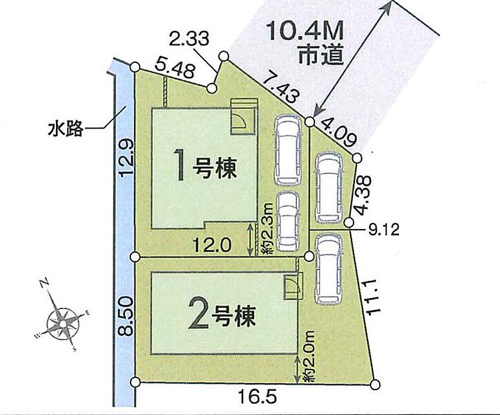 | 駐車場 | 2台 | 道路の幅員 | 2号棟:北東10.4m /1号棟:北東10.4m |