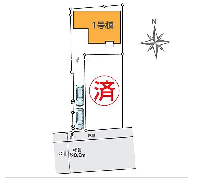 | 駐車場 | 2台 | 道路の幅員 | 1号棟:南8.9m |