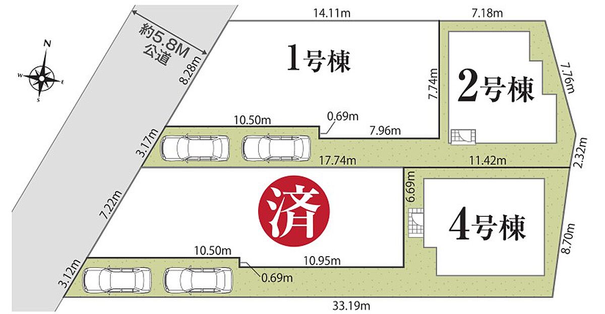 | 駐車場 | - | 道路の幅員 | 1号棟:西5.8m /2号棟:西5.8m /4号棟:西5.8m |