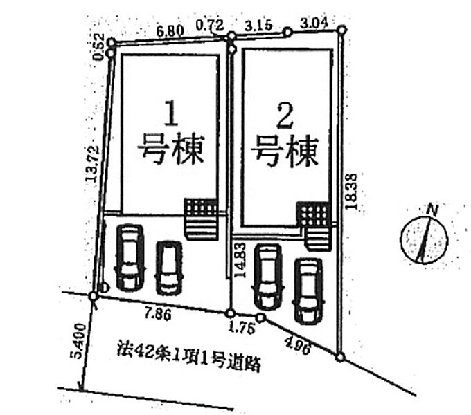| 駐車場 | 2台 | 道路の幅員 | 1号棟:南5.4m /2号棟:南5.4m |