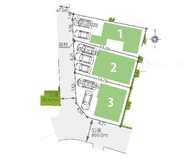 | 駐車場 | 2台 ~ 3台 | 道路の幅員 | 3号棟:西4m 南6m /1号棟:西4m /2号棟:西4m |