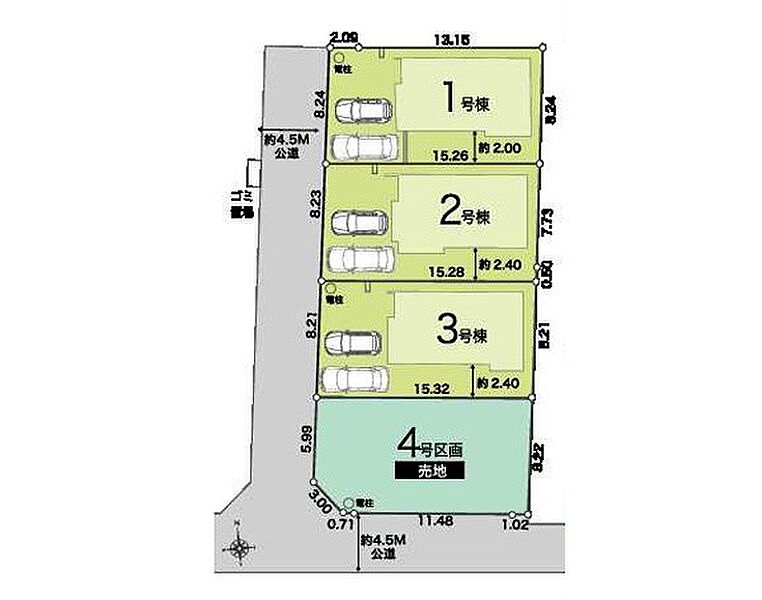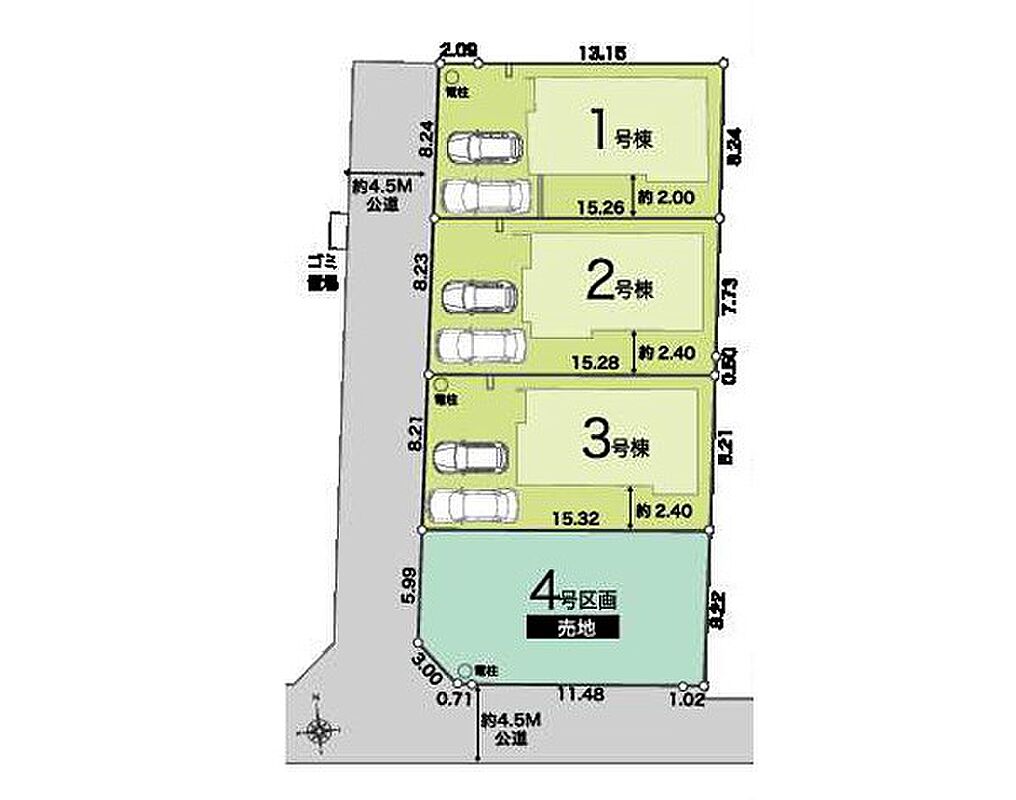 | 駐車場 | 2台 | 道路の幅員 | 2号棟:西4.5m /1号棟:西4.5m /3号棟:西4.5m |