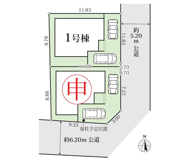 | 駐車場 | 2台 | 道路の幅員 | 1号棟:東5.2m |