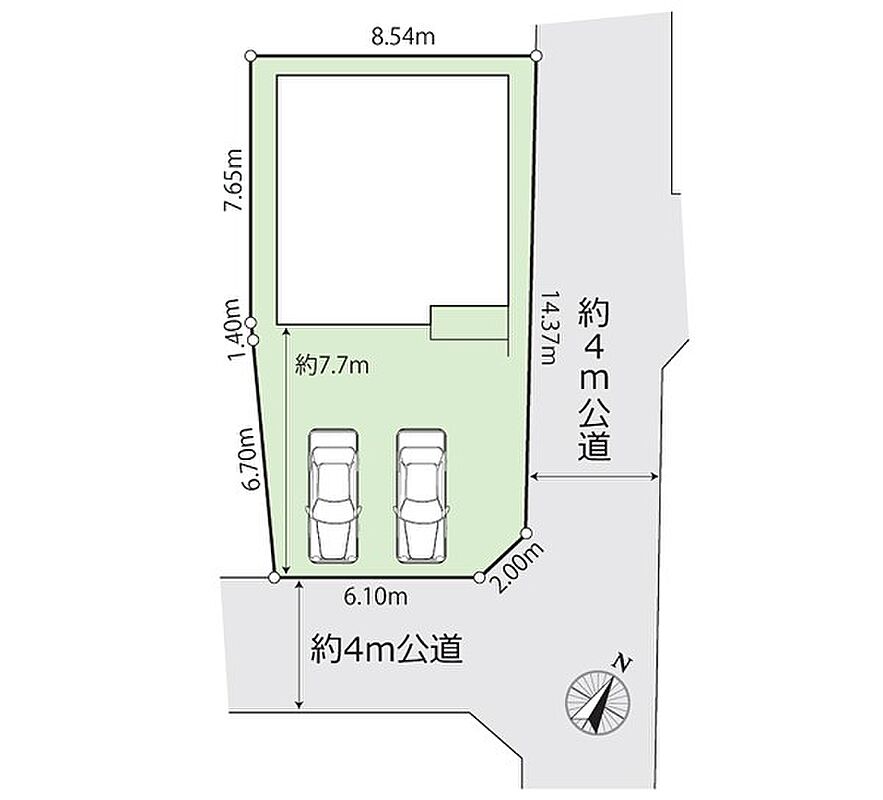 | 駐車場 | 2台 | 道路の幅員 | :北西4m 南東4m |