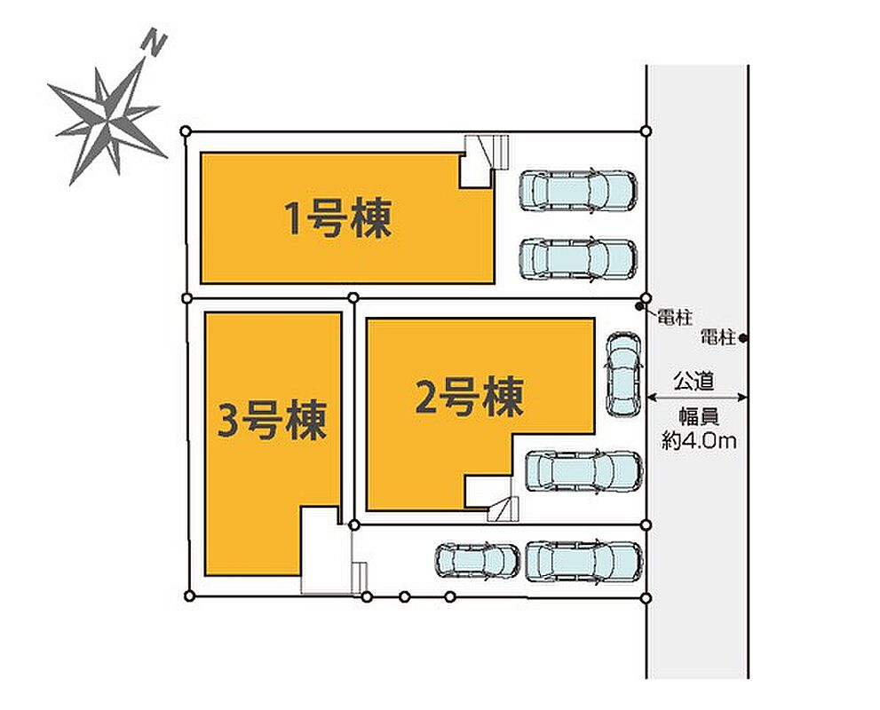 | 駐車場 | 2台 | 道路の幅員 | 1号棟:北東4m /2号棟:北東4m /3号棟:北東4m |