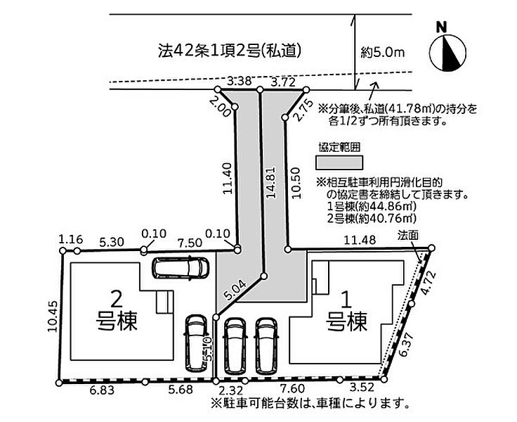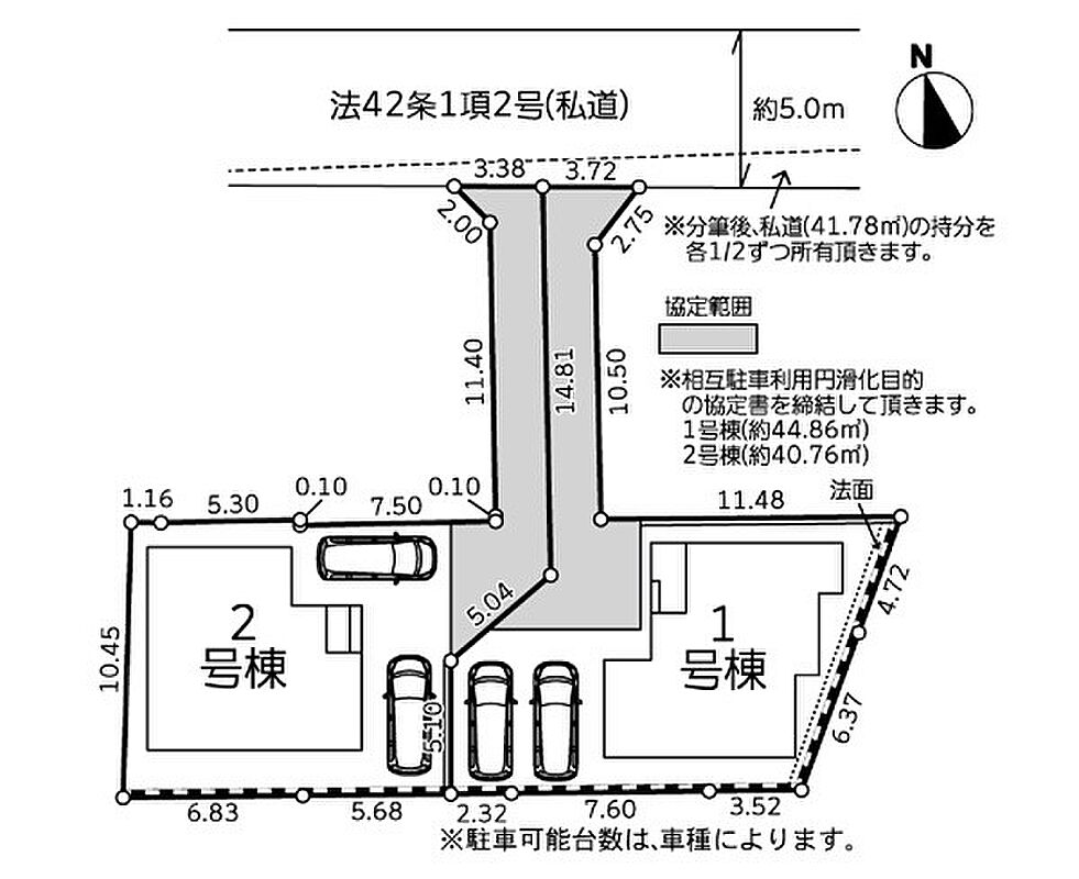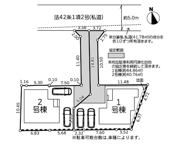 | 駐車場 | 2台 | 道路の幅員 | 2号棟:北5m |