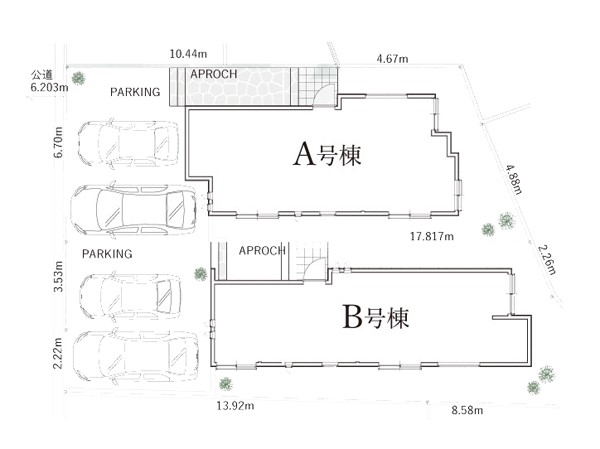| 駐車場 | 2台 | 道路の幅員 | A号棟:西6m /B号棟:西6m |