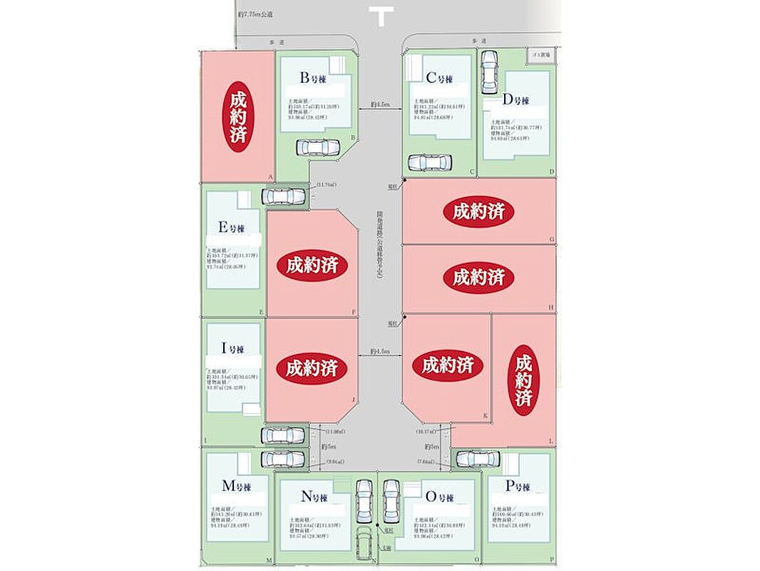 | 駐車場 | 1台 | 道路の幅員 | B号棟:北7.5m 東4.5m /E号棟:東4.5m /M号棟:東5m /I号棟:東5m /D号棟:北7.5m /C号棟:北7.5m 西4.5m /P号棟:西5m …他 |