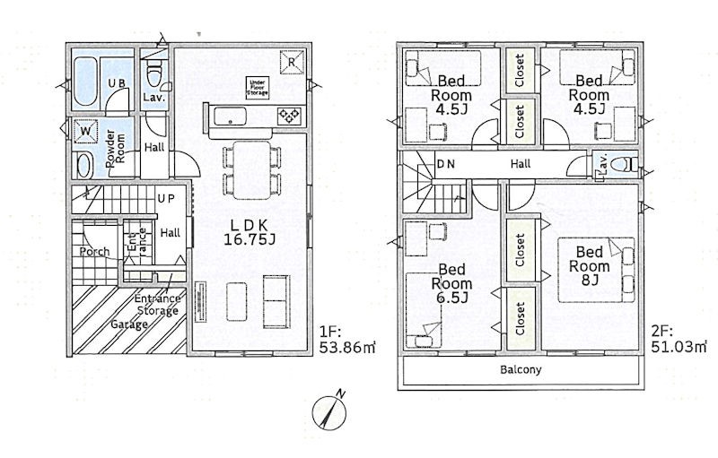 | 建物面積 | 97.20m2~99.63m2 | 土地面積 | 103.20m2~111.20m2<私道負担面積115.83m2 私道負担割合1/12> |