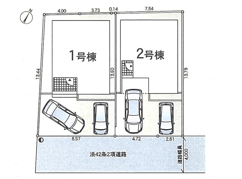 | 駐車場 | 2台 | 道路の幅員 | 2号棟:南東4m /1号棟:南東4m |