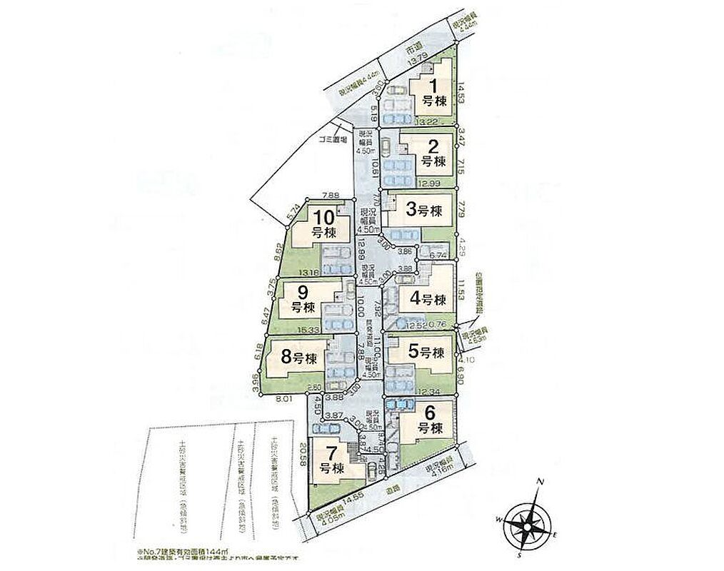 | 駐車場 | 3台 | 道路の幅員 | 8号棟:東4.5m /9号棟:東4.5m /7号棟:北東4.5m 南東4m /3号棟:南西4.5m /1号棟:北西4.4m 南西4.5m /5号棟:南西4.5m 北東4.6m …他 |