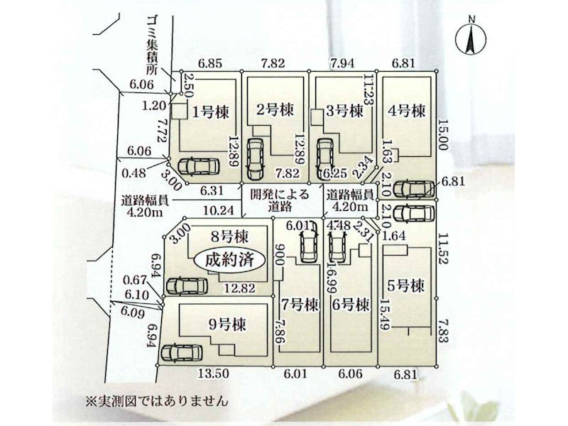 | 駐車場 | 1台 | 道路の幅員 | 1号棟:南4.2m 西6m /3号棟:南4.2m /2号棟:南4.2m /6号棟:北4.2m /9号棟:西6m /7号棟:北4.2m |