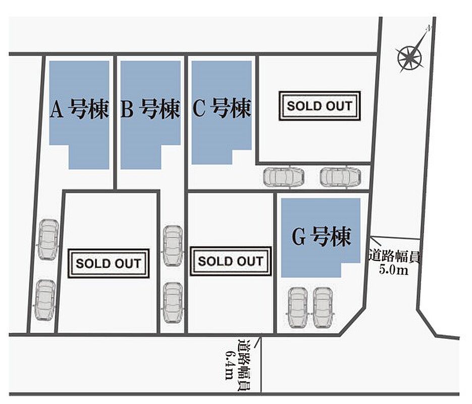 | 駐車場 | 2台 | 道路の幅員 | A号棟:南東6.4m /C号棟:北東5m /G号棟:北東5m 南東6.4m /B号棟:南東6.4m |