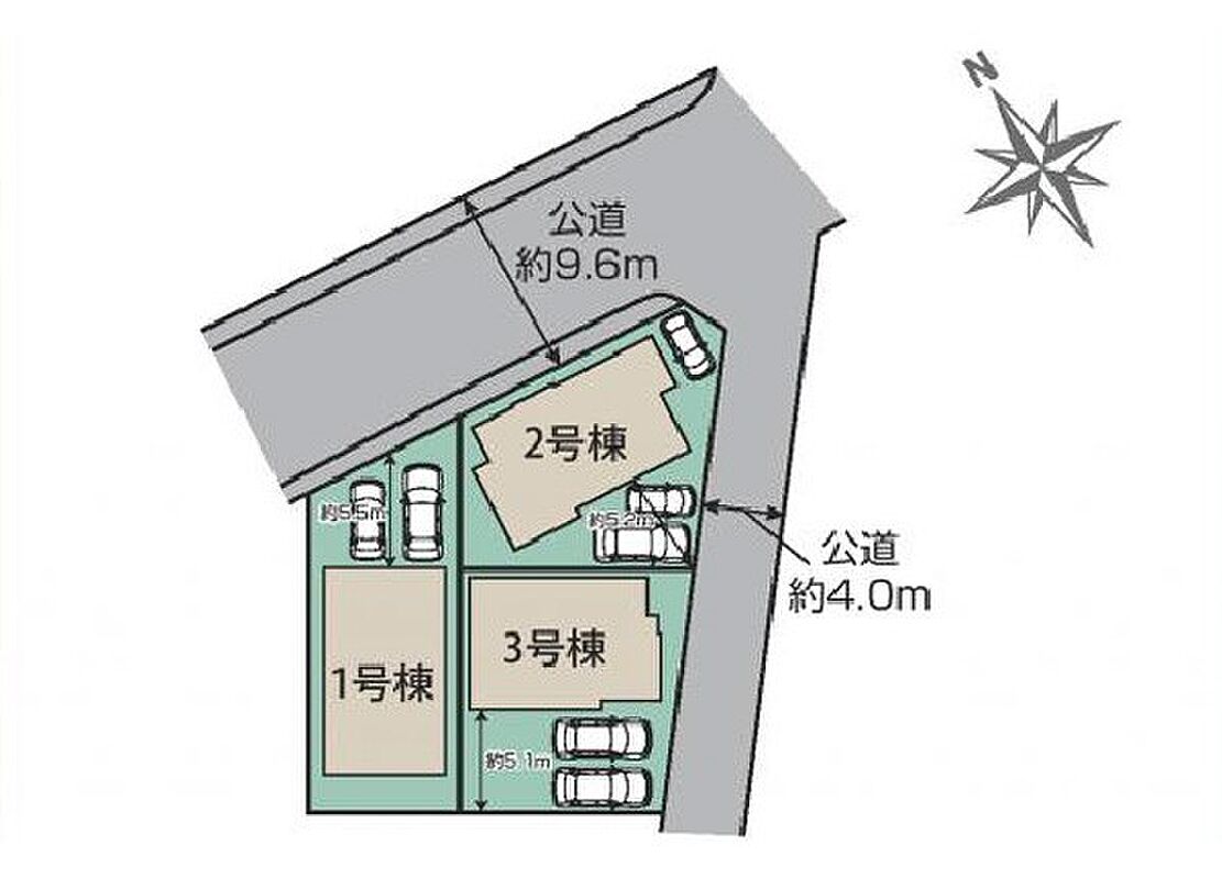 | 駐車場 | 2台 | 道路の幅員 | 1号棟:北9.6m /2号棟:北9.6m 南東4m |