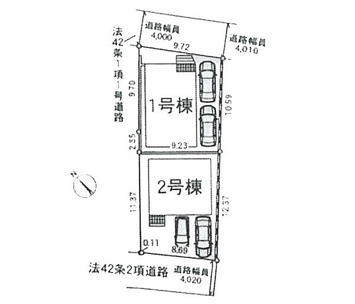 | 駐車場 | 2台 | 道路の幅員 | 2号棟:南西4m |