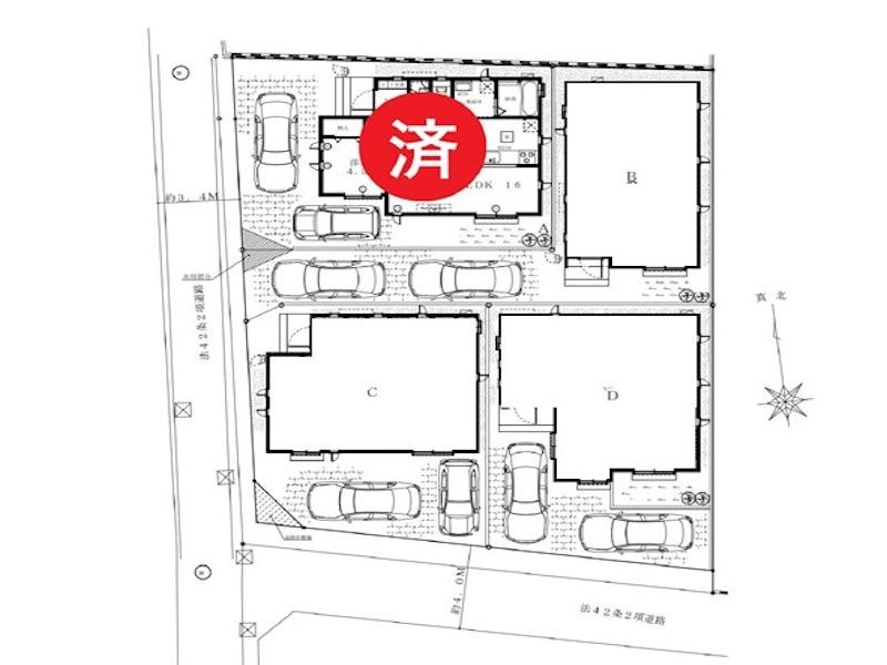 | 駐車場 | 2台 | 道路の幅員 | B号棟:西3.4m /C号棟:西3.4m 南4m /D号棟:南4m |